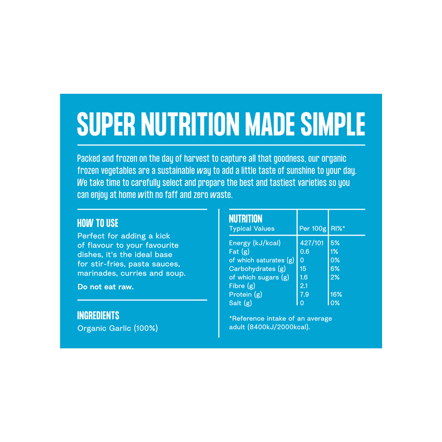 Picked and Frozen on the day of harvest to capture all that goodness, our frozen organic ingredients are a sustainable way to add a little taste of sunshine to your cooking in minutes. No peeling or chopping just effortless flavour and convenience.